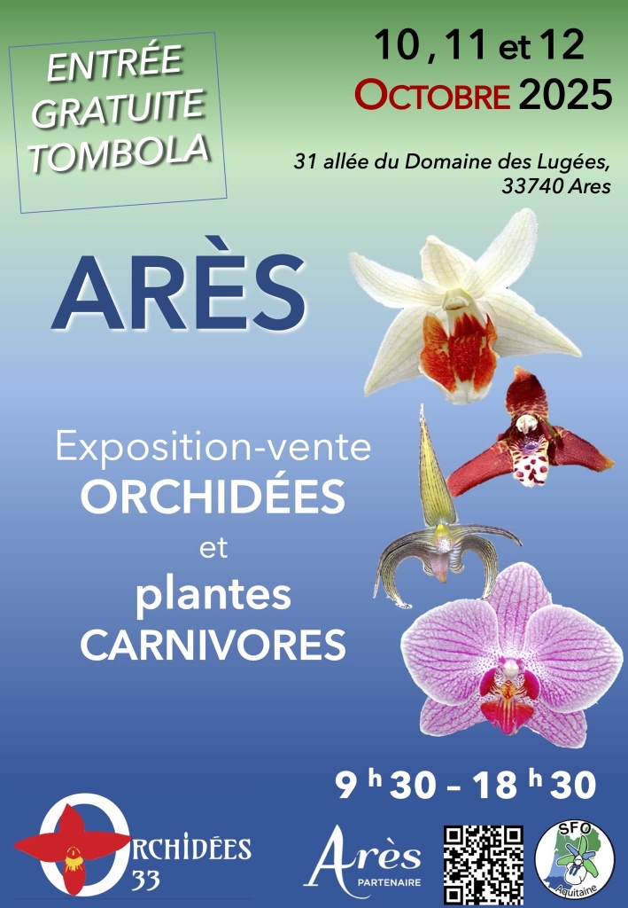 Exposition Vente d’Orchidées à ARES (33740) du 10 au 12 Octobre 2025 à la salle du domaine des Lugées.